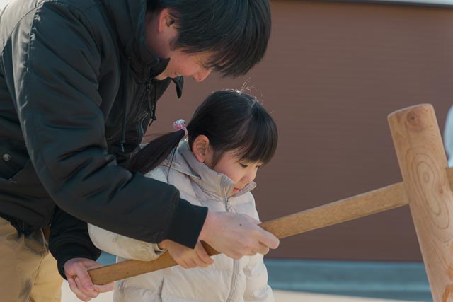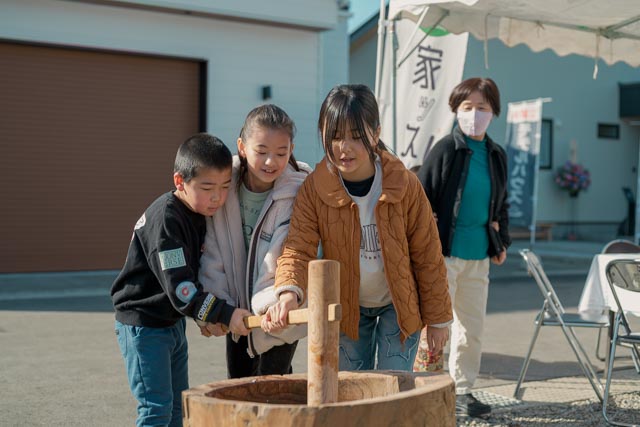 当日は「餅つき大会」も開催! お子様たちが一生懸命にお餅をつく姿や、お父さんと一緒に楽しむ笑顔があちこちで見られました。家づくりは、家族の思い出づくりから始まってもいい。私たちはそう考えています。