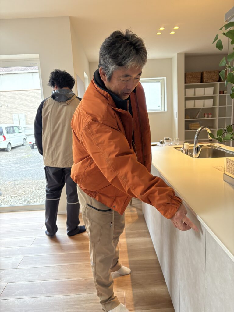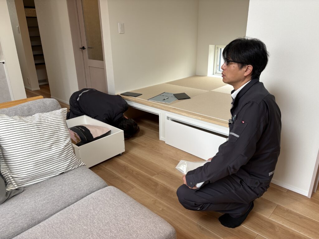 タタミ下の収納をどうやってきれいに仕上げようかと、現場監督と設計と意見を出し合っていました。^^