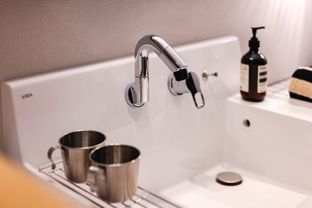ハイバックのベッセル+壁付けの水栓は汚れにくくてお手入れも楽ちん♪