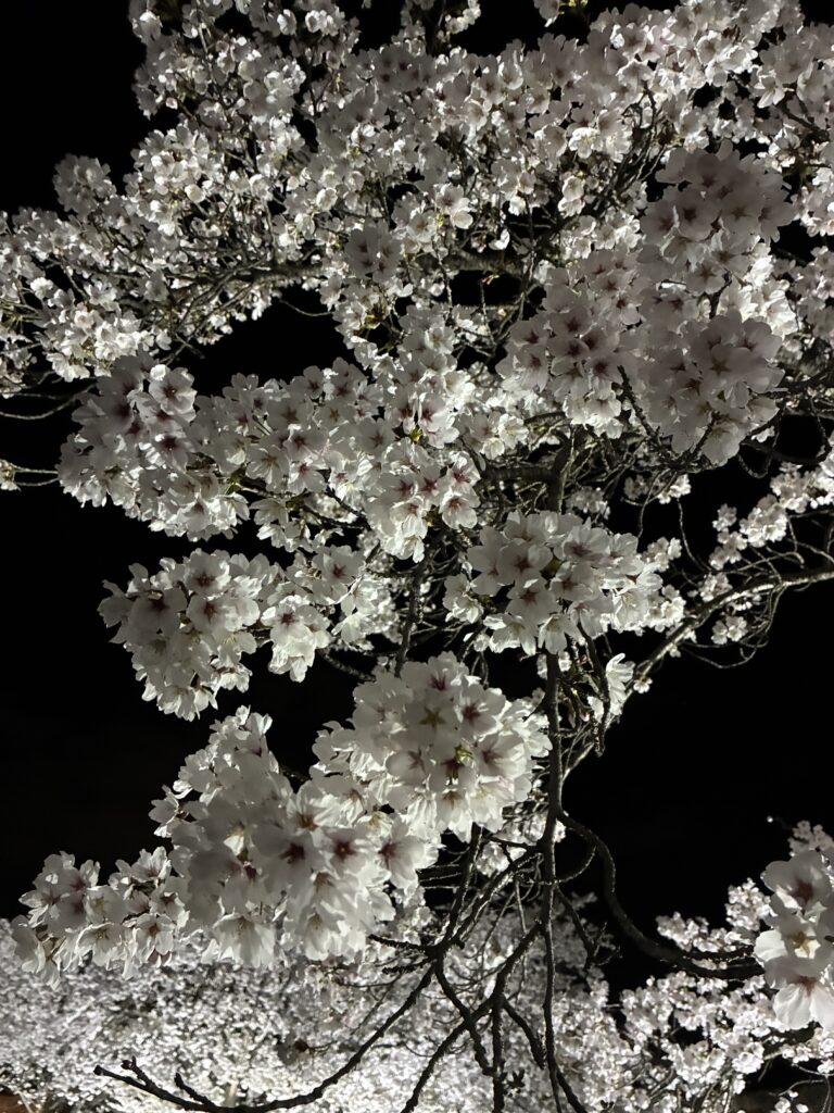 先日、娘に誘われて夜桜を見に行きました。昼間の桜も綺麗ですが、夜はライトアップもされ桜自ら発光しているかのような「花あかり」を放っていました。